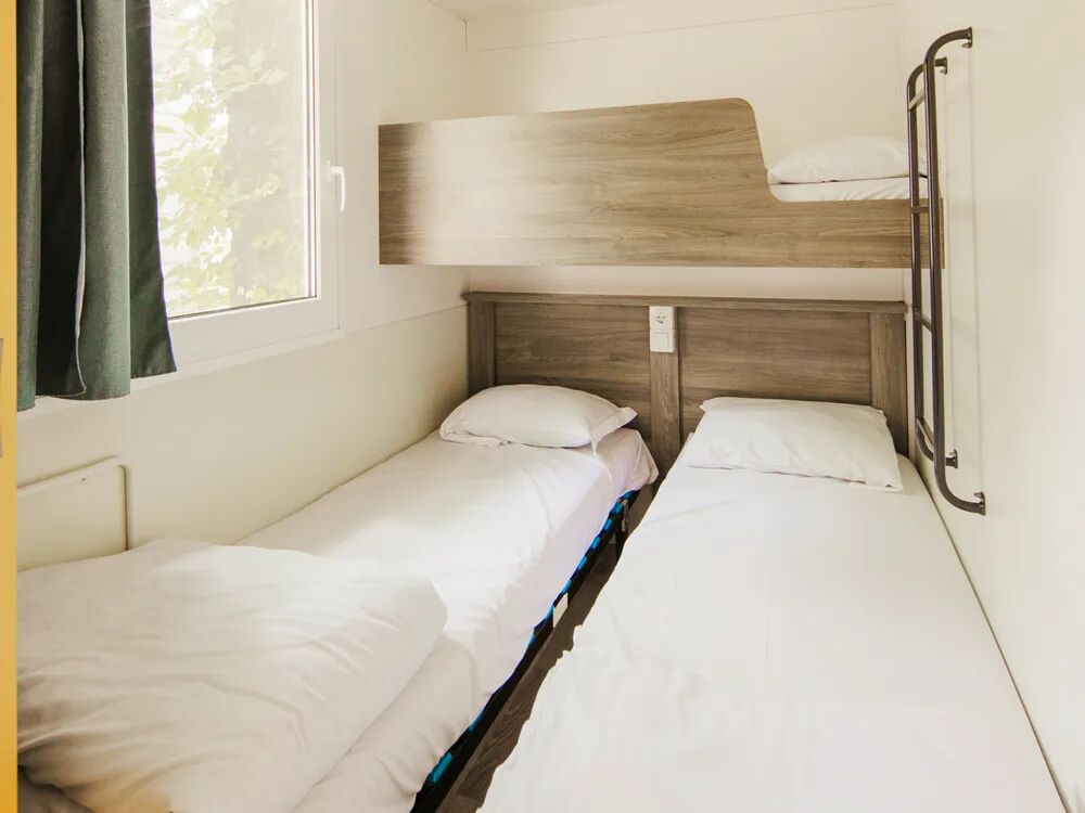 De Classic Relax beschikt over 2 slaapkamers. In de ouderslaapkamer staat een 2-persoonsbed van 2.00 x 1.40m groot. In de kinderslaapkamer vind je twee losse bedden of twee losse bedden en een bed overdwars op hoogte. Tevens is er in de woonkamer ruimte voor één slaapplaats. In elke stacaravan is standaard 1 bedrekje aanwezig zodat jouw peuter niet uit bed kan vallen (vast metalen bedrek of los bedrek). Bovendien zijn alle slaapkamerramen voorzien van muggenhorren.