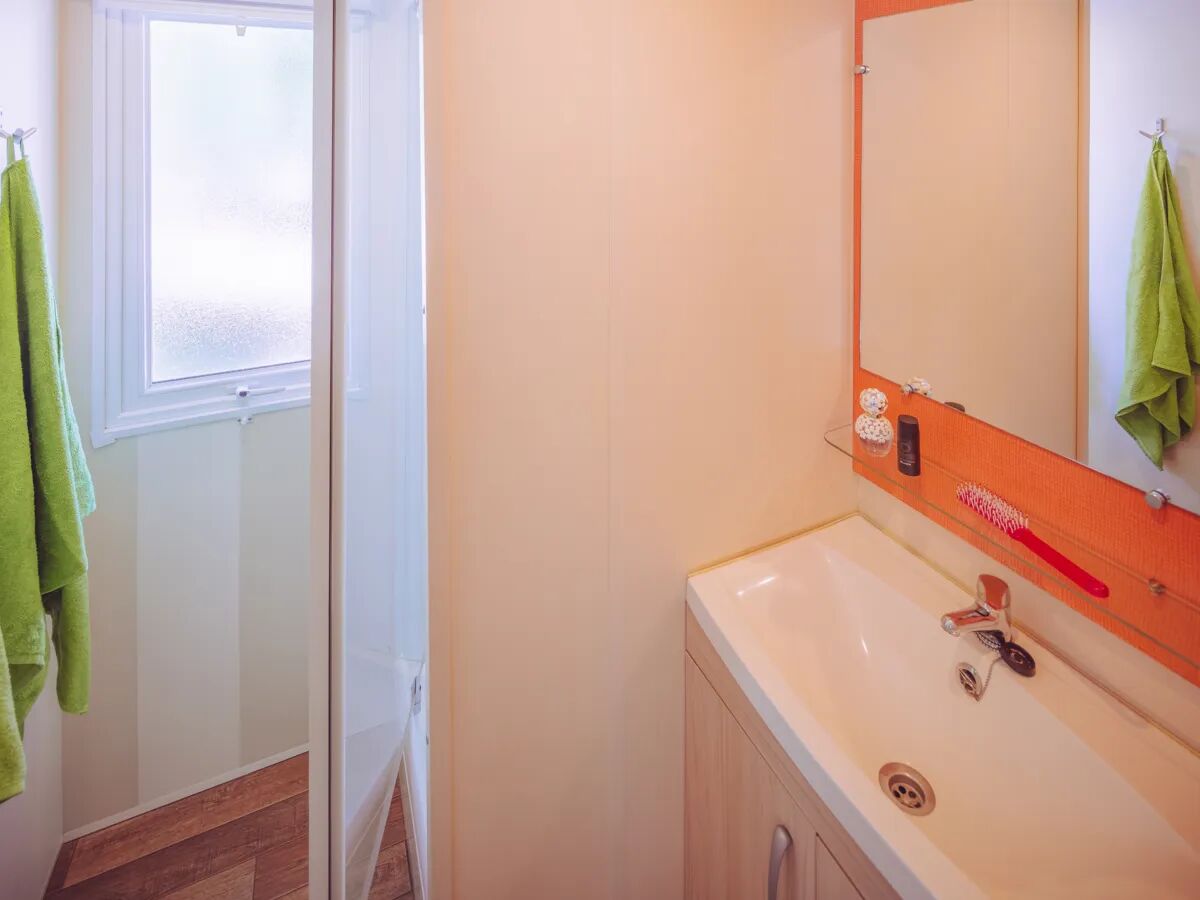 In de ruime woonkamer met airconditioning vind je een zithoek en keuken. De keuken is voorzien van een vaatwasser, hoge koelkast met apart vriesgedeelte, magnetron, waterkoker, 4-pits gasfornuis en een koffiezetapparaat. Je kunt vanaf de zithoek ontspannen tv kijken op de aanwezige satelliet-TV met alle belangrijke Nederlandse zenders. Zo weet je zeker dat je niets zult missen van uw favoriete (sport)programma’s. De kleintjes zullen zeker blij zijn met hun Nederlandse kindertelevisie. De badkamer is voorzien van een ruime douchecabine en wastafel met grote spiegel en er is een apart toilet aanwezig.