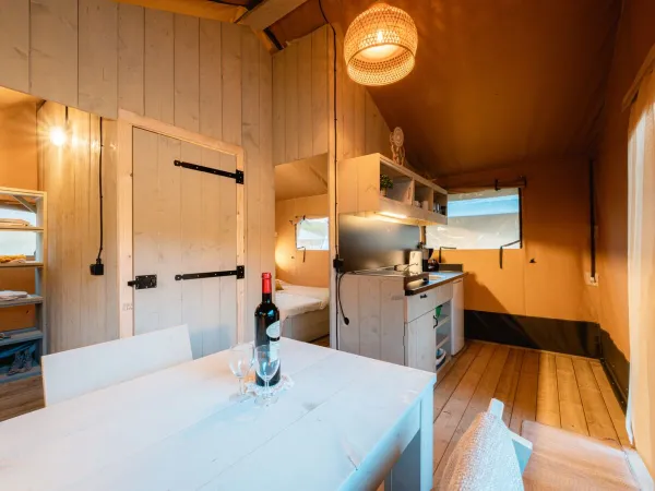 Veranda Veranda hekjeOnze luxe lodgetent Spring is voorzien van een ruime, geheel overdekte veranda met loungebank die afsluitbaar is met een hekje. De lodgetent is prachtig ruim en staat in zijn geheel op een houten veranda van zo’n 30 cm hoogte.