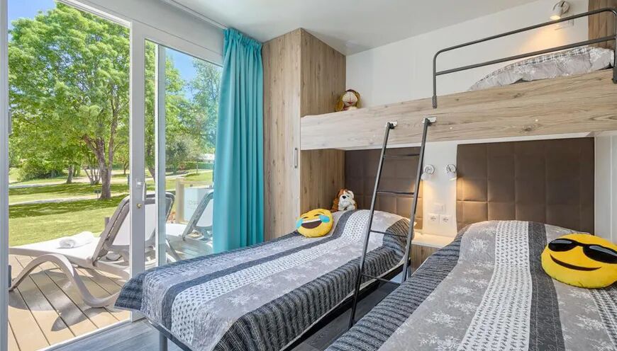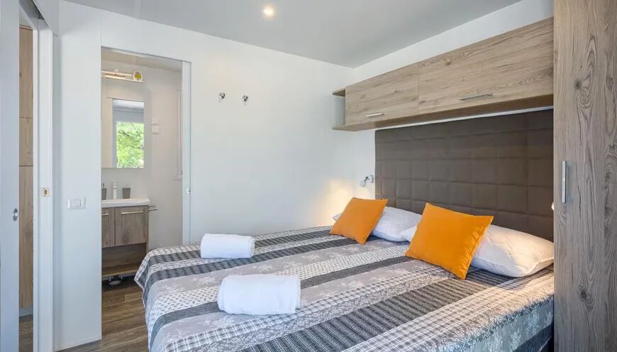 Deze luxe stacaravan beschikt over 2 slaapkamers. In de ouderslaapkamer staat een tweepersoonsbed van 2.00 x 1.60m groot. In de 2e slaapkamer zijn 2 éénpersoonsbedden en een bed overdwars op hoogte voor een kind aanwezig. In iedere stacaravan is standaard 1 bedrekje aanwezig en zijn alle slaapkamerramen voorzien van muggenhorren.