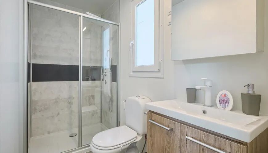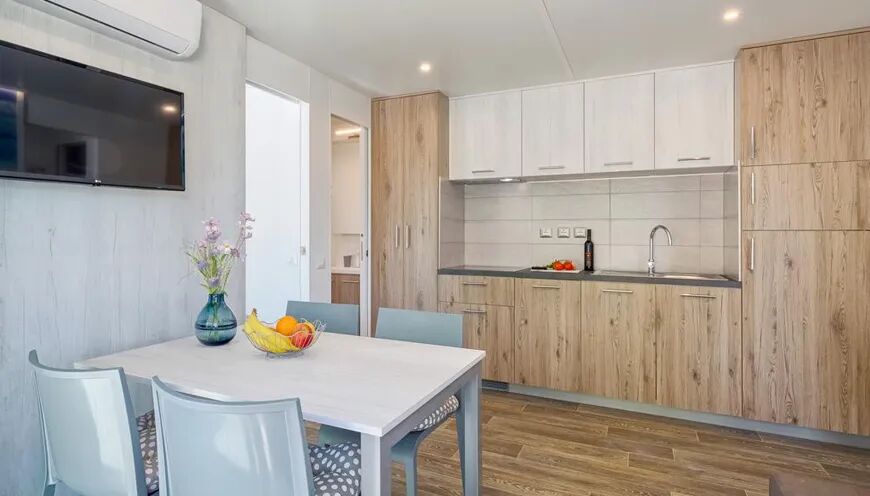 De keuken is standaard voorzien van een koelkast met apart vriesvak, een 4-pits gasfornuis, magnetron, Nespresso koffiezetapparaat, waterkoker, een uitgebreide keukeninventaris en een vaatwasser. In de woonkamer hangt een satelliet televisie. Voor extra comfort is deze stacaravan voorzien van 2 badkamers. Een badkamer is ensuite aan de tweepersoonsslaapkamer en beschikt over een wastafel, ruime douchecabine en toilet. De andere badkamer is uitgerust met een toilet, wastafel en ruime douchecabine.